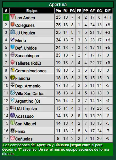 El campeón del certamen clasificará a una definición contra el del Clausura (se disputará en el segundo semestre) por el primer ascenso. A su vez, los equipos suman puntos para una tabla general que definirá, concluidos el Apertura y Clausura, qué seis conjuntos competirán en el Reducido, que dará el segundo pasaje a la Primera Nacional.