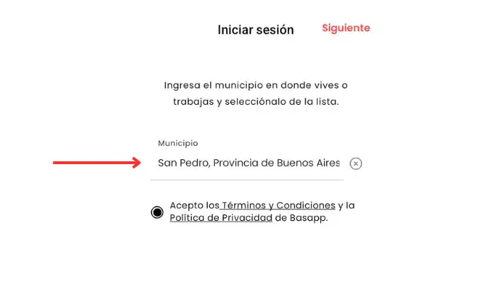 Luego de que se haya instalado, abriremos la App y nos aparecerá en pantalla el botón de ingreso, donde debemos seleccionar el municipio correspondiente y aceptar los términos y condiciones para que funcione correctamente.