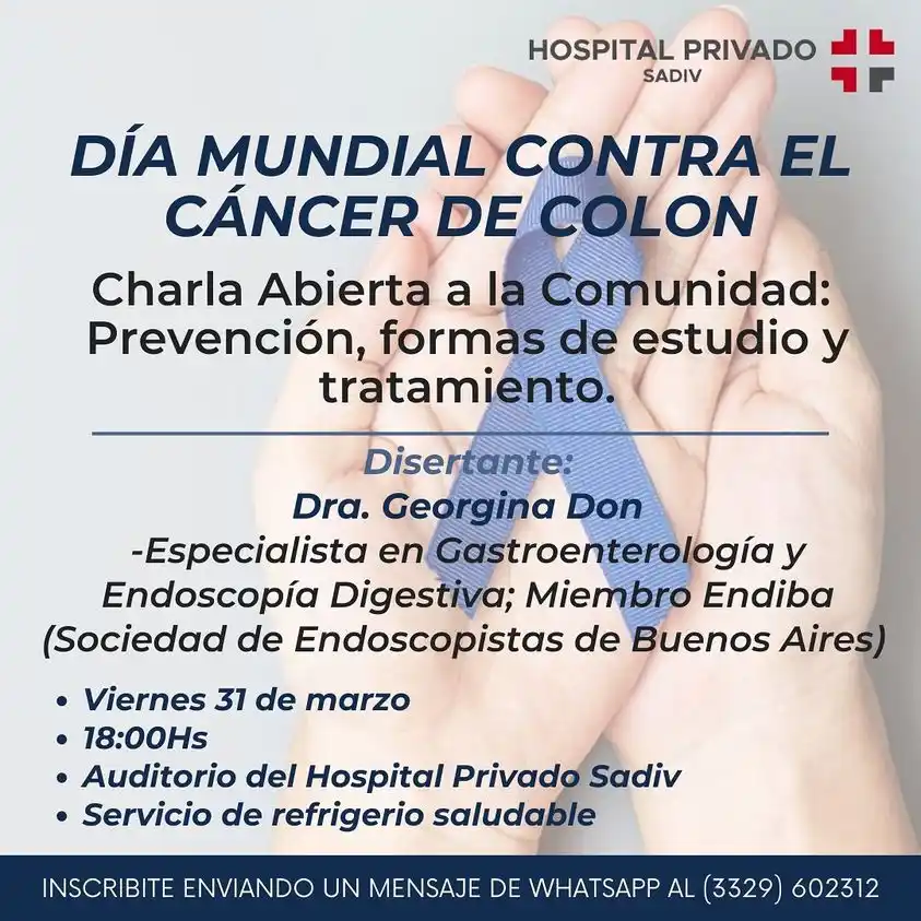 En el marco del Día Mundial Contra el Cáncer de Colon, el viernes 31 de marzo a las 18:00 tendrá lugar una charla en el auditorio del Hospital Privado Sadiv, a cargo de la gastroenteróloga y endoscopista Georgina Don.