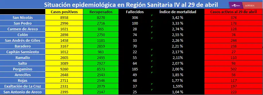 La tabla la lidera San Nicolás con 306 fallecidos sobre 8.958 contagiados, lo que equivale al 3,42 %. Además, actualmente tiene 374 casos activos y se ubica segundo de Pergamino que acumula 502 aunque con un índice de mortalidad de 2 % (185 decesos sobre 9260 positivos)