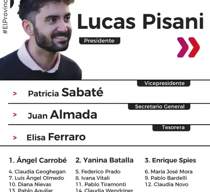 Las listas que compiten son la número 14 que encabeza el ex Diputado Germán López lleva como vicepresidenta a Norma Atrip, como Secretario General a Guillermo Corti y a Estela Bernan como tesorera. La número 123 está encabezada por el Concejal Lucas Pisani e integrada por la Consejera Escolar Patricia Sabaté como Vice, Juan Almada como Secretario General y Elisa Ferraro como Tesorera.