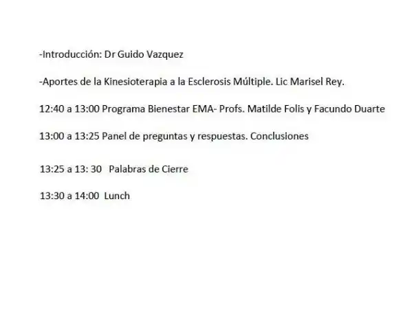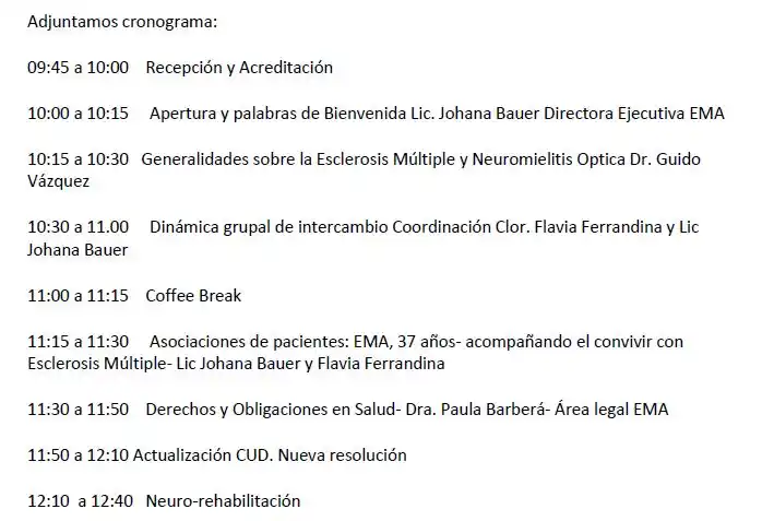 Las actividades sobre esclerosis múltiple y calidad de vida comenzarán a las 9.45 y finalizarán a las 14.00. Habrá charlas dirigidas por especialistas en las que se explicará la enfermedad, los derechos y obligaciones en salud, resoluciones, aportes de la kinesioterapia, entre otras contribuciones.