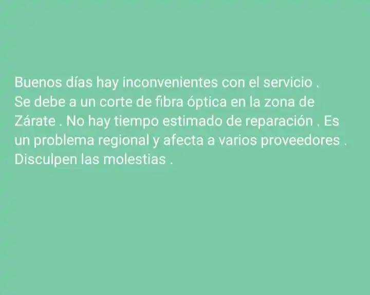 No sería el único proveedor afectado por un desperfecto en la fibra óptica que se produjo a la altura de Zárate. La Opinión reporta la franja horaria en la que comenzaron a efectuarse los reclamos desde nuestra ciudad. Crece el malestar de los usuarios.