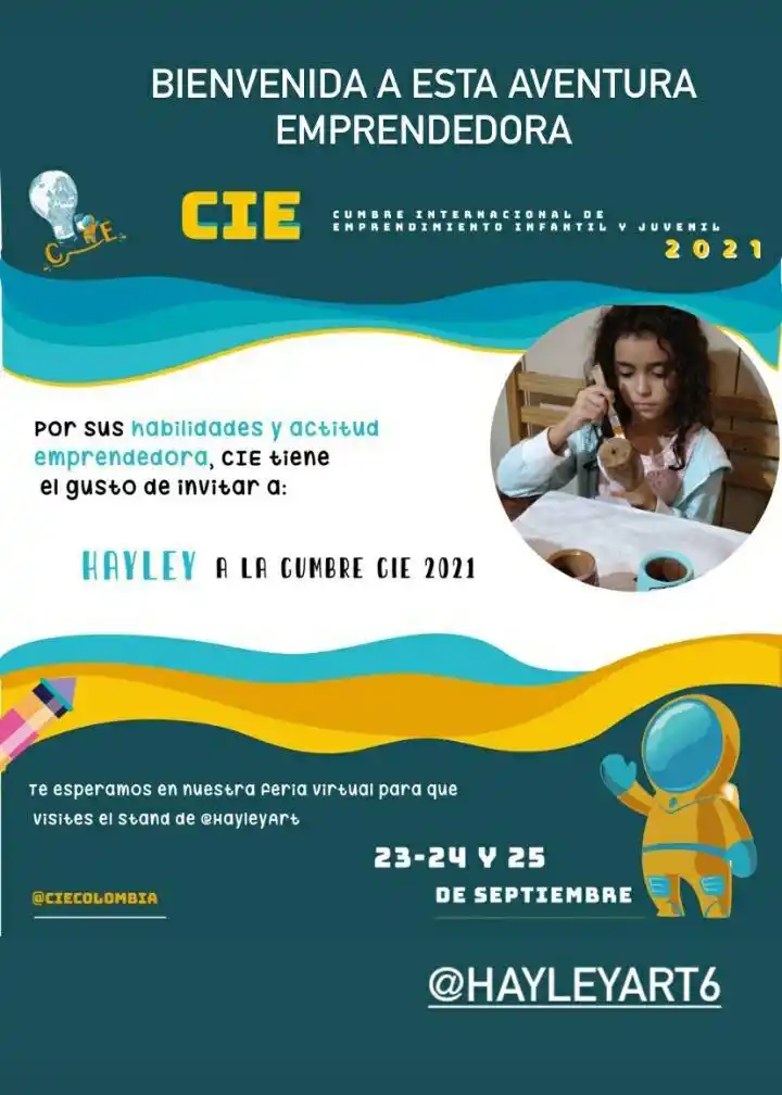 Hayley Loy Gil fue convocada para participar durante 23, 24 y 25 de septiembre en una feria virtual. Desde su cuenta de Instagram, la pequeña artista ofrece objetos pintados a mano que llamaron la atención de la Cumbre Internacional de Emprendimiento Infantil y Juvenil de Colombia.
