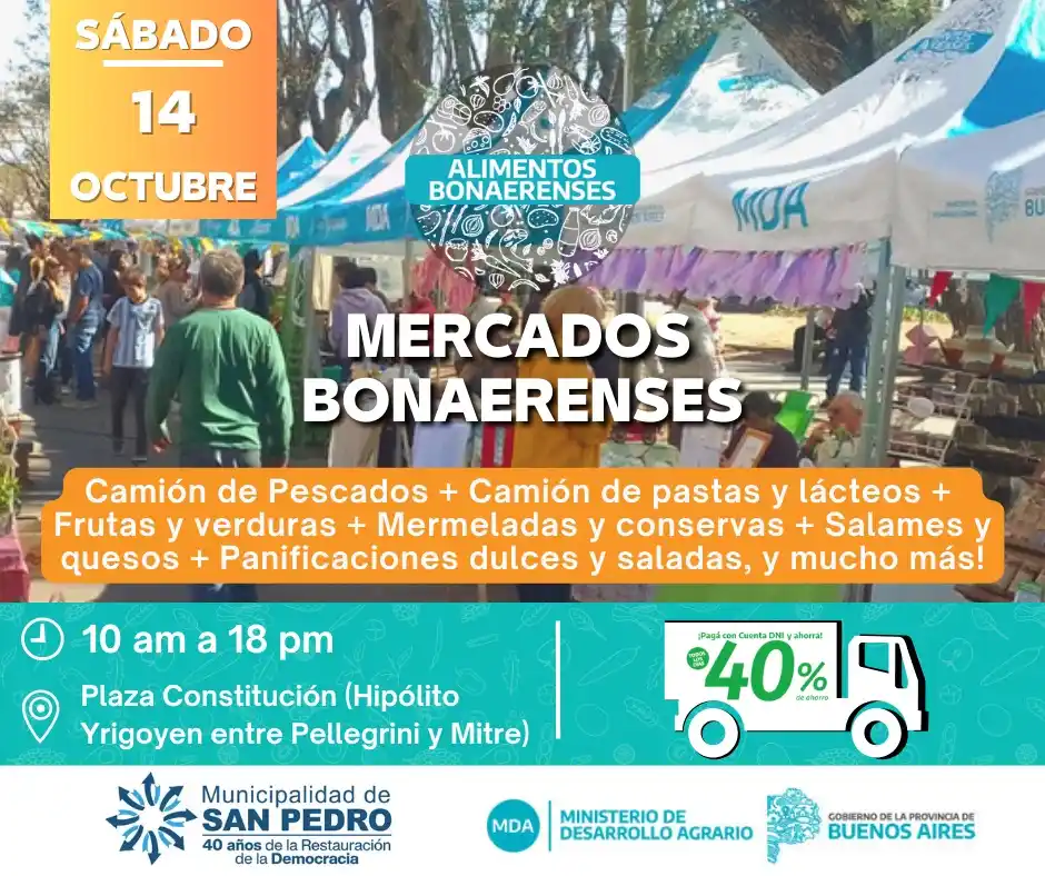 Este sábado 14 de octubre, de 10.00 a 18.00, tendrá lugar la feria provincial Mercados Bonaerenses en la Plaza Constitución. Los puestos se extenderán en calle Hipólito Yrigoyen, entre Mitre y Pellegrini.