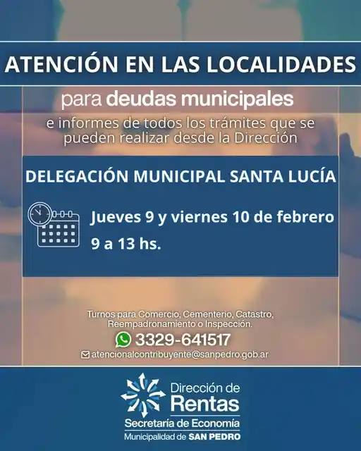 Este jueves 9 de febrero, los representantes brindarán atención al público en la Delegación Municipal de Santa Lucía en el horario de 9.00 a 13.00. La actividad se repetirá el día viernes en el mismo horario.