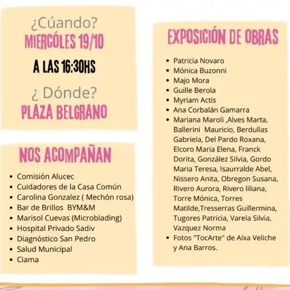 Las actividades programadas en la plaza comprenden charlas informativas sobre el cáncer de mama a cargo de profesionales de la salud, Dra. Ana Taurizano (ginecóloga), Dr. Gustavo Wagner (mastólogo, ginecólogo), Dr. Martín Barbi (especialista en diagnóstico por imagen), Dra. Micaela Schiaffino (medicina clínica), Licenciada Analía Cancelo (kinesiología), Dra. Paula Crelier (medicina orthomolecular).
