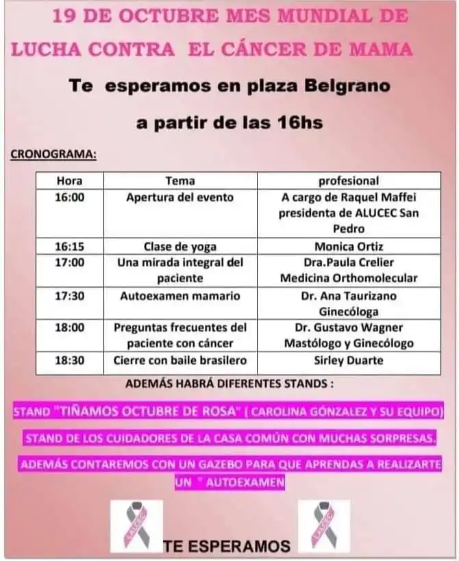 Este 19 de octubre, en el marco del mes mundial de lucha contra el cáncer de mama, Lalcec San Pedro organizó una jornada en Plaza Belgrano con charlas y otras actividades.