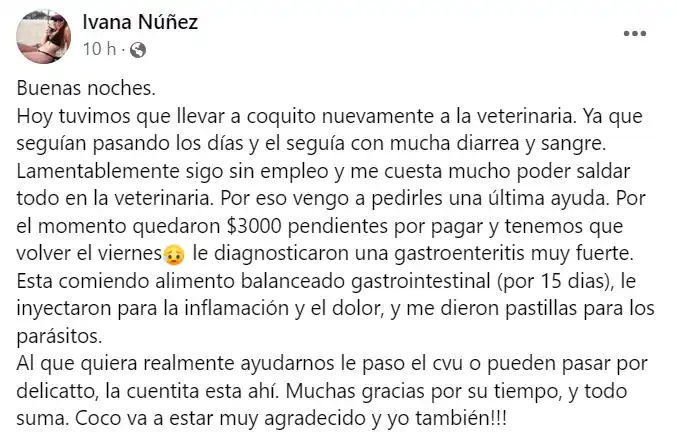 “Pasan los días y sigue con mucha diarrea y sangre. Lamentablemente sigo sin empleo y me cuesta mucho poder saldar todo en la veterinaria. Por eso vengo a pedirles una última ayuda”, pidió.