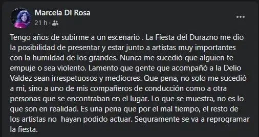 “Tengo años de subirme a un escenario. La Fiesta del Durazno me dio la posibilidad de presentar y estar junto a artistas muy importantes con la humildad de los grandes. Nunca me sucedió que alguien te empuje o sea violento. Lamento que gente que acompañó a la Delio Valdez sean irrespetuosos y mediocres. Qué pena, no solo me sucedió a mí, sino a uno de mis compañeros de conducción como a otras personas que se encontraban en el lugar. Lo que se muestra, no es lo que son en realidad. Es una pena que por el mal tiempo, el resto de los artistas no hayan podido actuar. Seguramente se va a reprogramar la fiesta”, escribió Di Rosa minutos después de que haya culminado la fiesta.