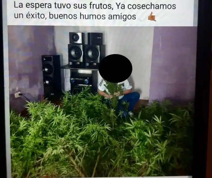 En el lugar la DDI y la Policía se encontraron con la mujer que había realizado la publicación en redes sociales y otras personas mayores de edad. En el patio había una planta de marihuana de unos tres metros de alto brotes de cogollos en gajos cercada con un boyero eléctrico. Además, en una habitación hallaron dos cajas que contenían cogollos que estaban siendo secados para su consumo.