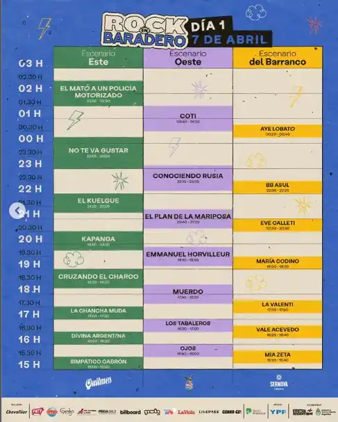 El día 1, la fiesta comienza a las 15.00 con Simpático Cabrón en el escenario Este y el cierre está previsto a la 01.30 con El Mató a un Policía Motorizado en el mismo escenario.