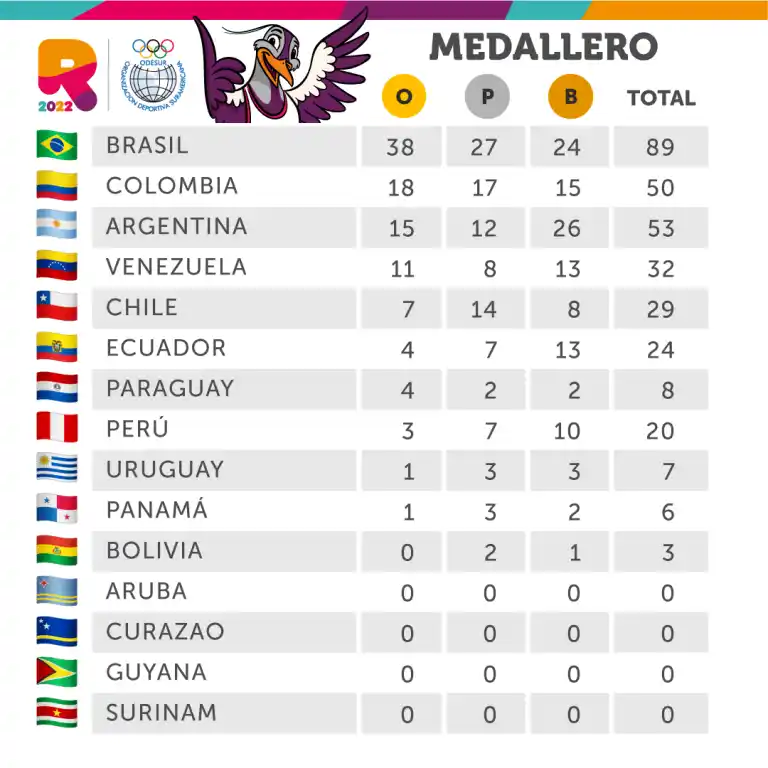 En el medallero de Rosario 2022 la delegación de Argentina está tercera con 15 preseas de oro, 12 de plata y 26 de bronce. El líder, cómodo, es Brasil con 38, 27 y 24 respectivamente mientras que Colombia es segundo con 18, 17 y 15. De los 15 países que incursionan en el prestigioso certamen internacional, tres todavía no hicieron podio: Curazao, Guyana y Surinam.