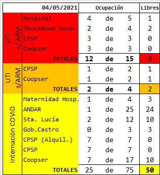 Según el detalle enviado a los medios, ya no hay camas en las unidades de terapia intensiva (UTI) de las clínicas privadas y en el Hospital quedan una una en el sector UTI y dos en el Shock Room.