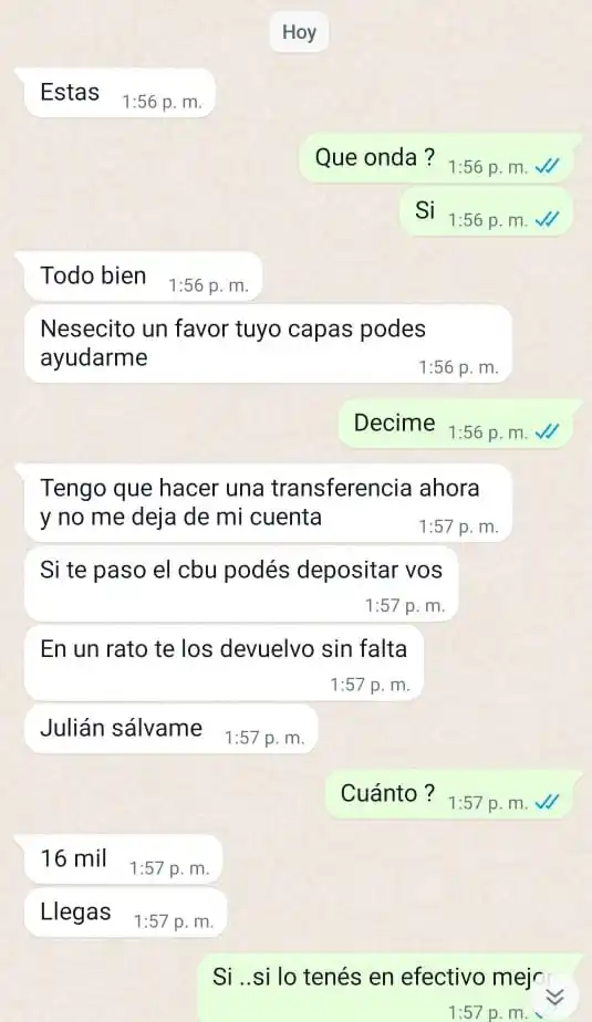 Le intervinieron la cuenta, le pidieron a su contactos que por favor le prestaran dinero. Uno de sus amigos cayó en la estafa sin percatarse de que no era él y le transfirió 36 mil pesos.