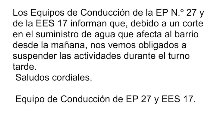 Los equipos directivos de la primaria 27 y de la secundaria 17 comunicaron que suspenden las actividades este jueves debido al corte del suministro de agua que afectó a la zona.