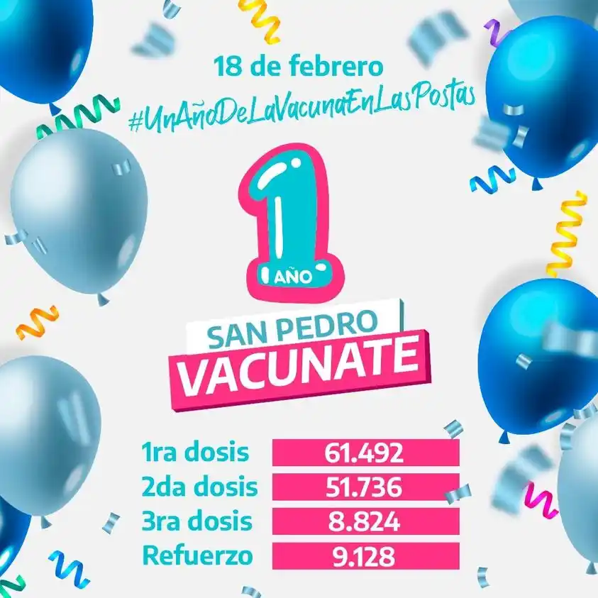 Este viernes se cumple un año desde que se instaló en San Pedro el vacunatorio del programa Vacunate. El distrito lleva aplicadas casi 61.500 primeras dosis; mas de 51.700 segundas; y alrededor de 18 mil entre terceras y refuerzos. "Gracias a todos y todas por poner el brazo", dijo Camila Caballero.